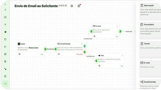 No-code de verdade: processos sob medida para a sua operação. Crie fluxos, regras e aprovações personalizados e ajuste sempre que precisar, sem código e sem depender de programador.