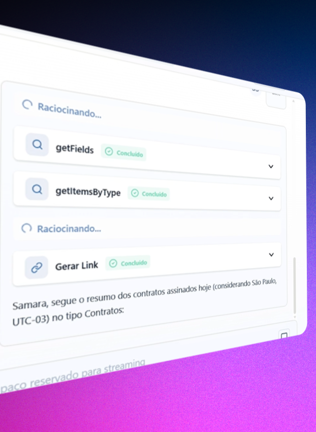 API aberta para conectar com ERPs, CRMs e qualquer outro sistema. Times técnicos integram de forma independente ao workspace.